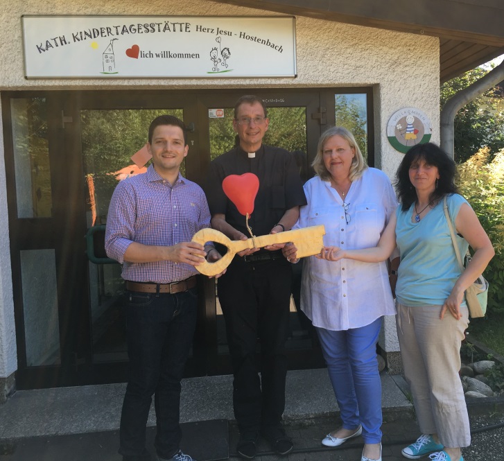 Bei strahlendem Wetter hatte sich das Team um Leiterin Eva Maria Bock einiges einfallen lassen, um große und kleine Besucher zu verwöhnen. Wie Sie wissen, wird die Einrichtung ab August in die Trägerschaft der Gemeinde Wadgassen übergehen. Vorab wurde mit einem Rückblick auf die letzten 50 Jahre in einem schönen Gottesdienst der Trägerwechsel gefeiert und schon mal gemeinsam mit Pastor Peter Leick die obligatorische Schlüsselübergabe vollzogen.