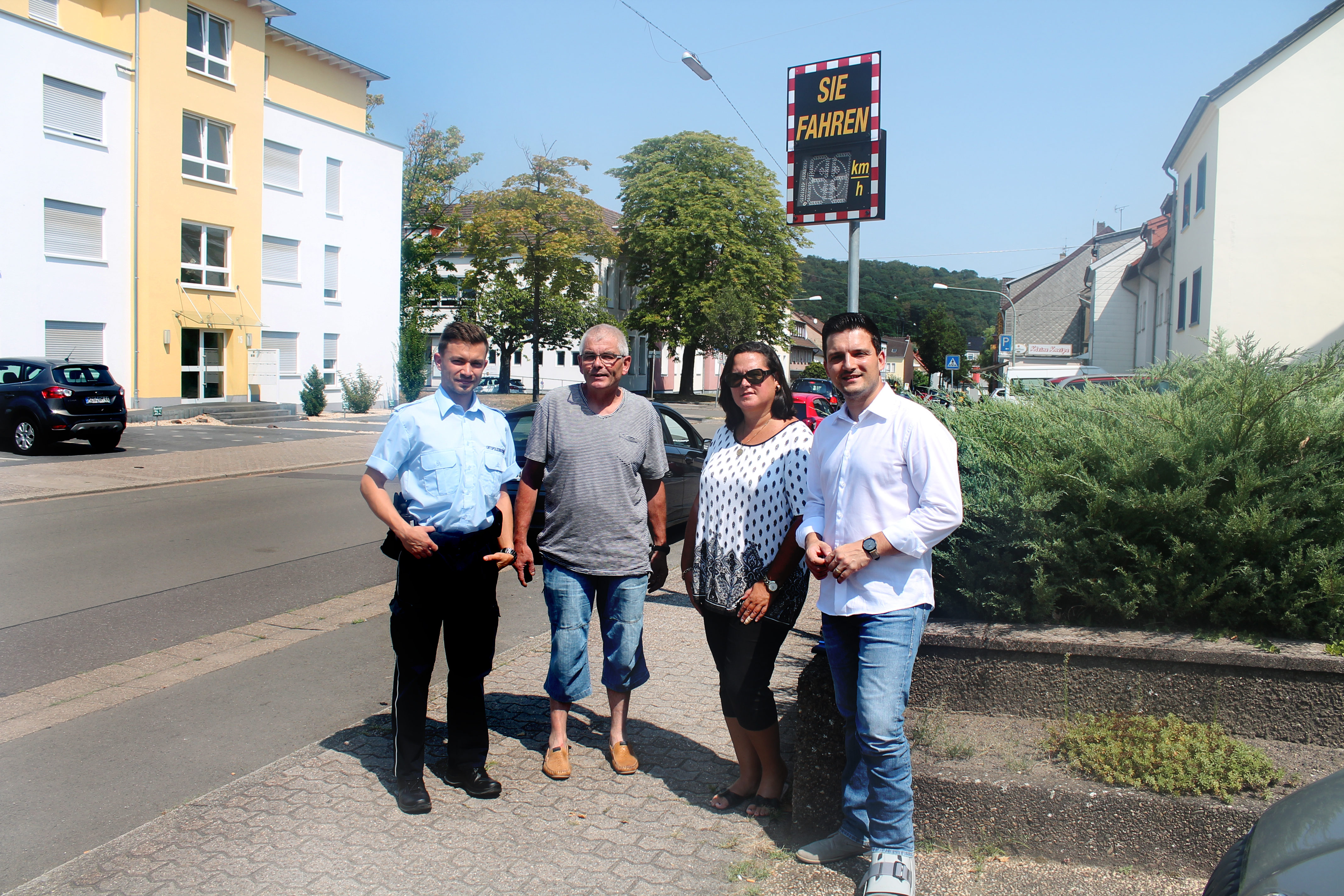 Pünktlich zum Schulanfang haben wir drei neue Geschwindigkeitstafeln in Hostenbach, Schaffhausen und Differten  in der Nähe der Grundschulen errichtet.  Ich habe mich mit Ortsvorsteher Axel Martin und meinen Mitarbeitern vom ordnungsgemäßen Betrieb der Tempo-Tafel überzeugt. Auch Schulleiterin Sandra Schweich-Fries und ihre Stellvertreterin Charlotte Ebel begrüßen diese Maßnahme als wichtigen Beitrag, den Schulweg für die Kinder sicherer zu machen. Die 2.500 Euro pro Geschwindigkeitstafel wurde von Sponsoren bereitgestellt. Dafür ein herzliches Dankeschön! Das ist gut investiertes Geld, denn viele Autofahrer fahren eher aus Unachtsamkeit und nicht aus Rücksichtslosigkeit zu schnell. OPB-Leiter Holger Tabellion sieht Erfahrungen aus Hessen bestätigt, wo diese Tempohinweise längst mit ihren grünen bzw. roten Smileys dazu beitragen, den Verkehr zu verlangsamen und den Schulweg für die Kinder sicherer machen.