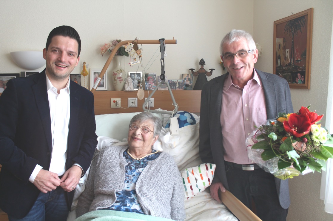 Grund zur Freude hatte auch Frau Alwine Löwenbrück aus Hostenbach. Im Seniorenheim St. Hildegard feierte die rüstige und schlagfertige Dame ihren 90. Geburtstag und mit Ortsvorsteher Axel Martin überbrachte ich die Glückwünsche der Gemeinde.