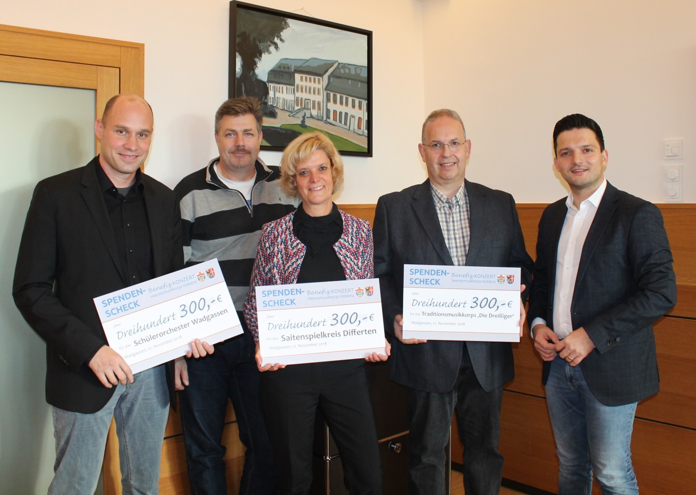 Gefreut haben sich sicher auch der Traditionsverein  „Die Dreissiger“, das Schülerorchester des Orchestervereins Wadgassen und  der Saitenspielkreis Differten. Aus der Benefizveranstaltung des Heeresmusikkorps Koblenz im April dieses Jahres in der Glückauf – Halle Hostenbach wurde ein toller Erlös erzielt. Jeweils 300 Euro daraus konnte ich bei einem kleinen Empfang im Rathaus den Verantwortlichen Frau Monika Beuren, Herrn Dr. Frank Morgenthal, Herrn Hendrik Kersten, sowie Björn Jakobs überreichen.