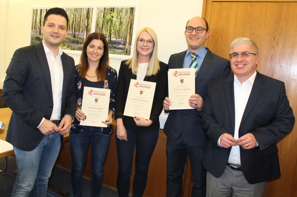 Ihre Verbeamtung auf Lebenszeit bei der Gemeinde konnte ich jetzt drei jungen Mitarbeitern in einer kleinen Feierstunde überreichen. Gemeinsam mit Hauptamtsleiter Gangolf Augustin übergab ich Frau Kathrin Adam, Frau Alma Hoffmann, sowie Herrn Holger Schwiertz ihre Urkunden. Alle drei haben die Ausbildung und ihre Probezeit mit Bravour in unserer Verwaltung bestanden und sind bereits heute an exponierten Stellen der Verwaltung tätig.