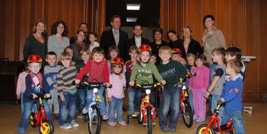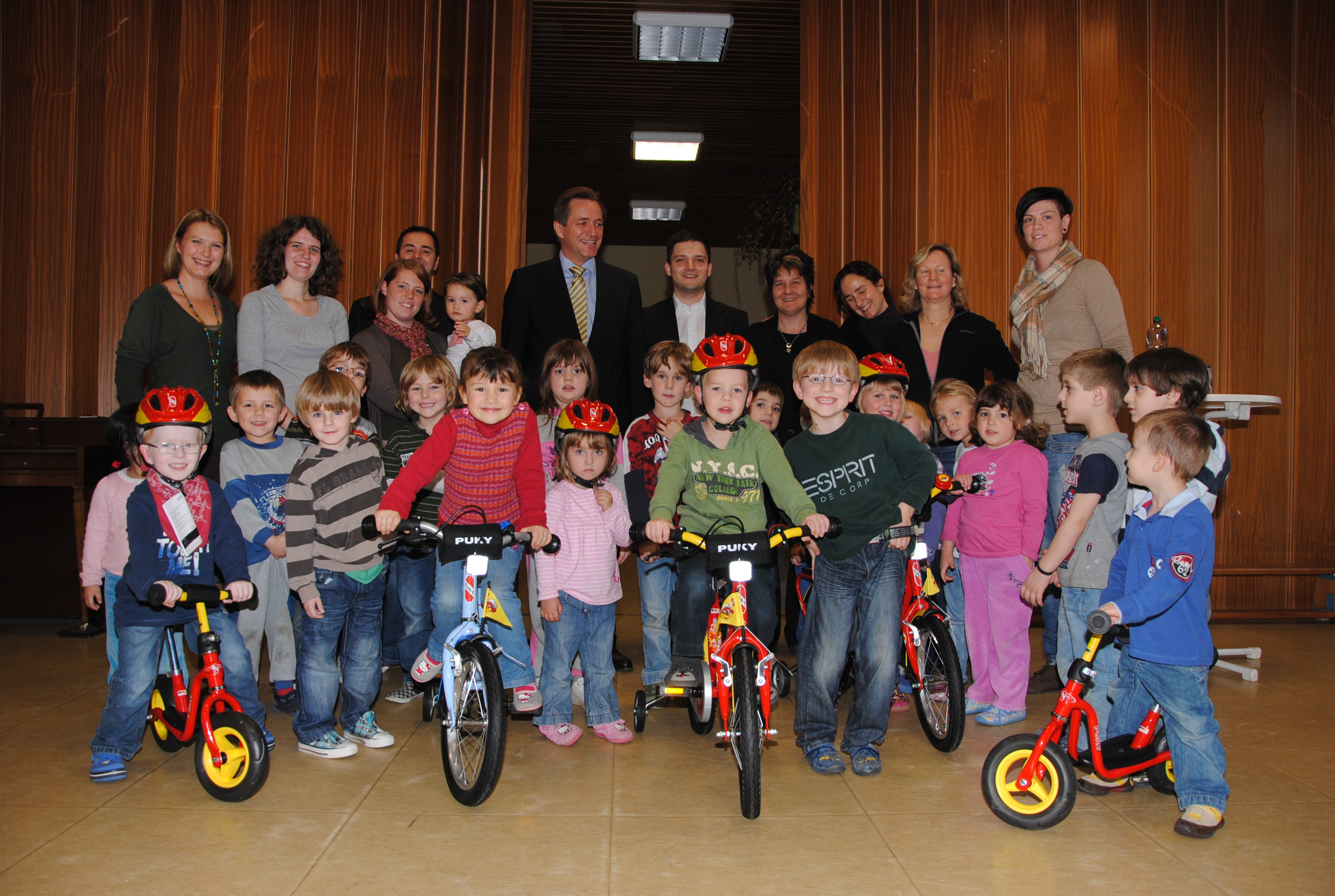 Sebastian Greiber übergibt die neuen Fahrräder und Laufräder dem Kindergarten Maria Heimsuchung. Unterstützt wird die Aktion durch das Gesundheitsministerium und dem Sparverein des Saarlandes.